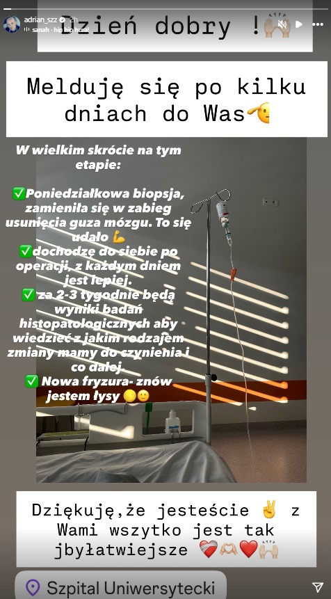 Adrian Szymaniak w czwartkowe przedpołudnie zamieścił na Instagramie wpis, w którym ujawnił, że jest już po zabiegu. Zaplanowana biopsja przekształciła się w szerszą ingerencję lekarską: