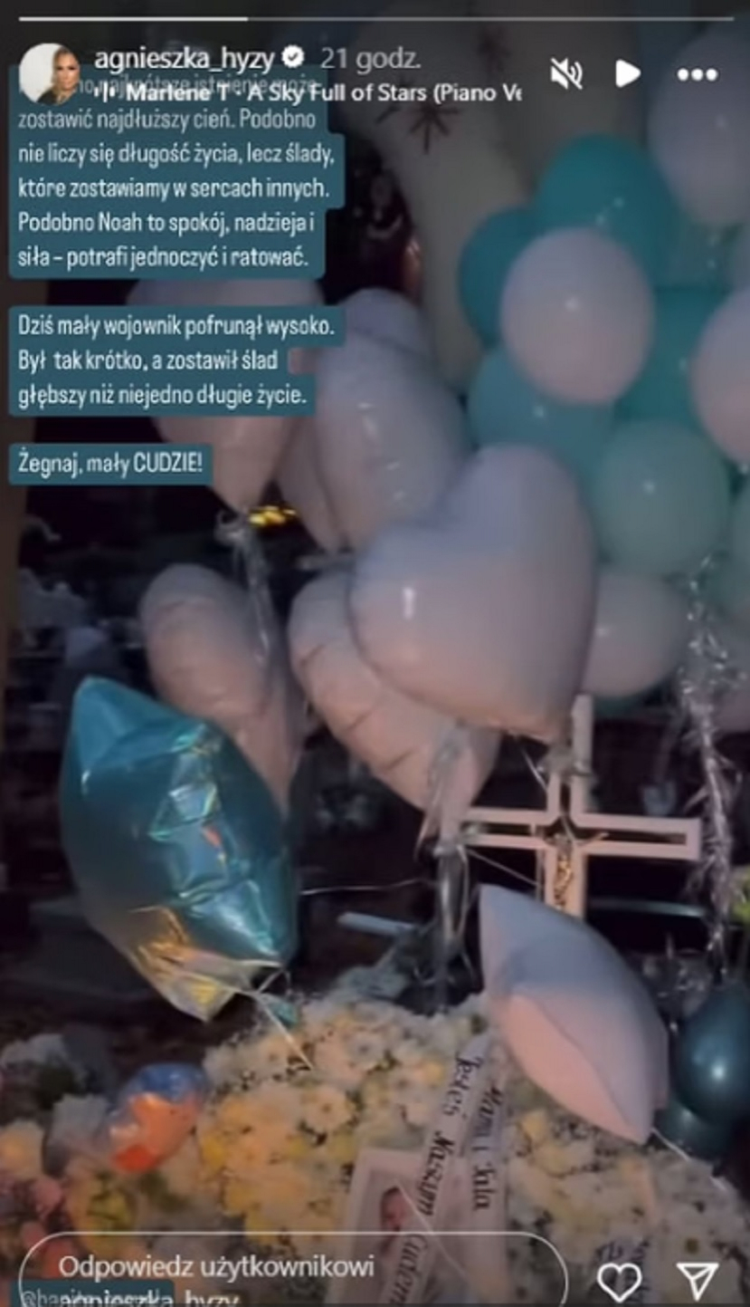 Agnieszka Hyży na swoim Instagramie opublikowała poruszające zdjęcie dziecięcego grobu otoczonego balonami. Dziennikarka Polsatu poinformowała obserwujących o tragicznym zdarzeniu. Zmarł Noah, syn jej znajomej. Matką chłopca była Anita Demianowicz, prowadząca blog banita.travel i autorka książki „Końca świata nie było”. Przez ostatnie miesiące relacjonowała postępy w walce z chorobą – dziecko zmagało się z rzadką chorobą Krabbego. Niestety nie udało się mu wyzdrowieć. Agnieszka Hyży napisała: