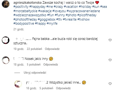 Pod najnowszą publikacją Agnieszki z wakacji internautki zaczęły zastanawiać się nad "naturalnością" jej twarzy, sugerując operacje plastyczne. Czy kształt nosa Kotońskiej rzeczywiście się zmienił, czy to tylko kwestia zmiany perspektywy w czasie robienia zdjęcia? Uczestniczka "Gogglebox. Przed telewizorem" do tej pory nie odpowiedziała na wpisy uzytkowniczek Insatgrama.