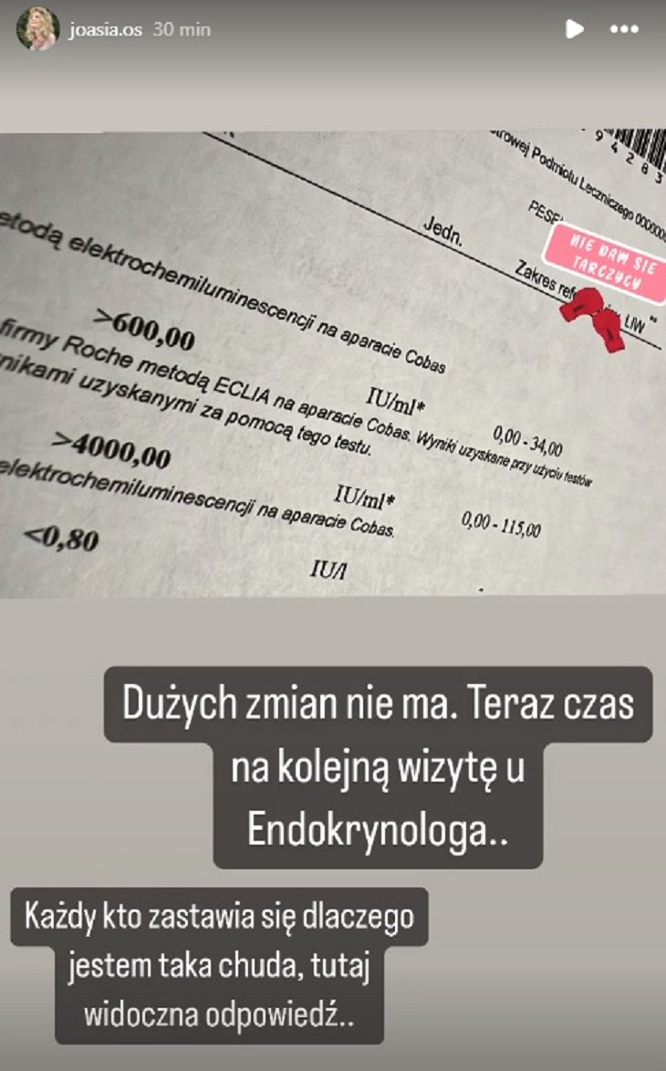 Dużych zmian nie ma. Teraz czas na kolejną wizytę u endokrynologa. Każdy, kto zastanawia się, dlaczego jestem taka chuda, tutaj widoczna odpowiedź.fot. kadr z Instagrama/joasia.os