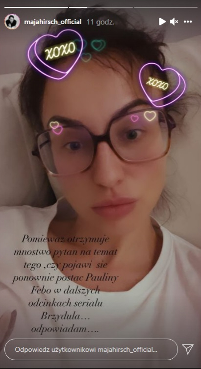 „BrzydUla 2” znów pojawiła się w TV! Nowe odcinki można oglądać cztery razy w tygodniu: od poniedziałku do czwartku o stałej porze. Kolejne epizody są również dostępne online, a wszystko to sprawia, że widzowie chętnie śledzą dalsze losy bohaterów, którzy przed laty skradli ich serca. Pierwsze odcinki „BrzydUli” zagościły bowiem w domach Polaków kilkanaście lat temu, a historia miłości Uli (Julia Kamińska) i Marka (Filip Bobek) mocno zapisała się w ich pamięci. Niedługo po finale pierwszego sezonu do produkcji zaczęły spływać prośby o wznowienie serialu, które… zostały wysłuchane! „BrzydUla” z nowym sezonem w zeszłym roku trafiła do „TVN7”, a od tamtej pory u Dobrzańskich i ich przyjaciół sporo się zmieniło! W najnowszych odcinkach Marek udał się do Włoch, by porozmawiać z Pauliną (w tej roli Maja Hirsch). Chociaż wątek Febo mocno zakorzenił się w scenariuszu, a sama postać była obecna aż do przerwy wakacyjnej, to w pojawiających się epizodach próżno szukać Mai Hirsch. Co jest tego powodem? Wiele wskazuje na to, że rozmowy agentki gwiazdy z producentami „B2” nie przyniosły oczekiwanego rezultatu, a postać Pauliny szybko nie pojawi się w nowych epizodach… Niedawno na swoim Instagramie głos w sprawie zabrała sama Hirsch, odnosząc się do zaistniałej sytuacji.