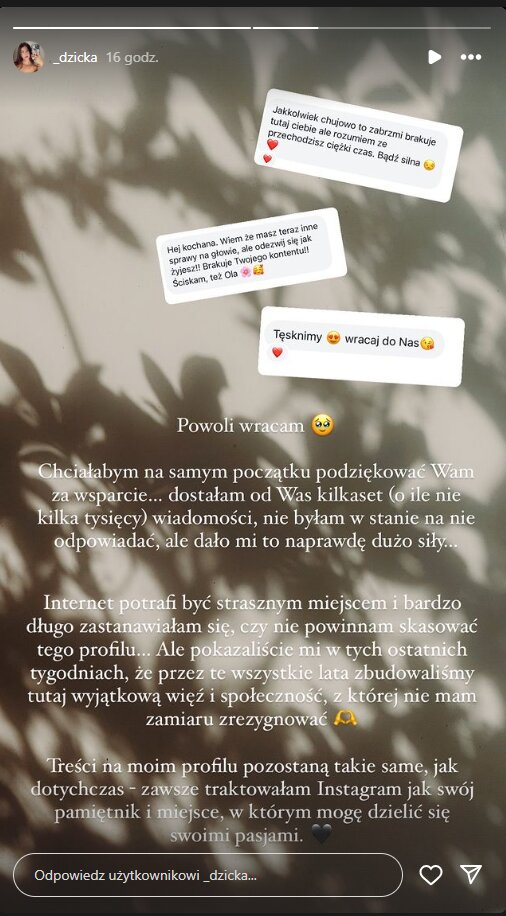 Po prawie miesiącu milczenia głos zabrała Aleksandra Dudzicka. Była partnerka siatkarza opublikowała relację na Instagramie, w której podziękowała fanom za dotychczasowe wsparcie. Napisała, że wiadomości, jakie otrzymywała, dały jej naprawdę dużo siły. Wyznała też, że miała moment, kiedy zastanawiała się nad skasowaniem konta, jednak ta sytuacja pokazała jej, jak fantastyczną społeczność udało się jej zgromadzić i nie chce z tego rezygnować.