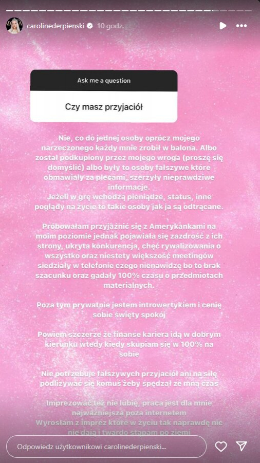 Na Instagramie kobieta zapowiedziała ostatnio sesję pytań i odpowiedzi. Jedna z osób była ciekawa, czy celebrytka ma jakichś przyjaciół. Jak się okazuje – nie posiada takich osób. Powodem jest to, że wszyscy w jakiś sposób ją oszukali: