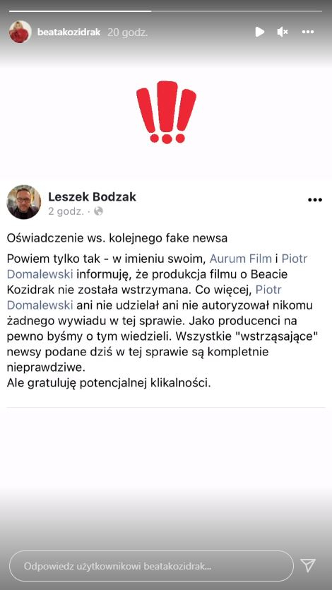 Do sprawy odniósł się producent filmu biograficznego o Beacie Kozidrak – Leszek Bodzak. Wprost nazwał "fake newsem" wszystkie obiegające media sensacyjne informacje o wstrzymaniu prac nad produkcją. Piosenkarka opublikowała treść oświadczenia producenta filmowej opowieści o swoim życiu w mediach społecznościowych.