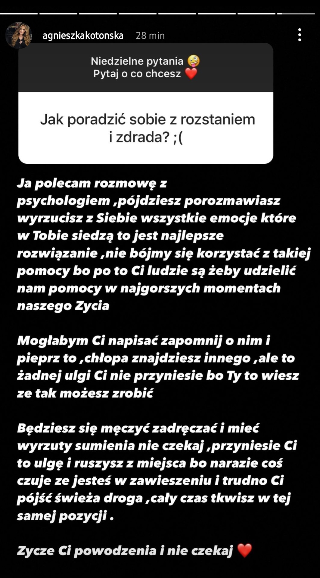 Agnieszka Kotońska nie pozostawiła pytania internautki bez odpowiedzi. Pod pytaniem o to, jak poradzić sobie z rozstaniem i zdradą, pozostawiła obszerny komentarz. Przede wszystkim poleciła spotkanie ze specjalistą. Nie zabrakło też słów wsparcia.