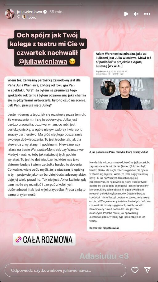 W odpowiedzi na tak miłe słowa, Wieniawa opublikowała kierujące do wywiadu InstaStory z podpisem „Adasiuuu ”.