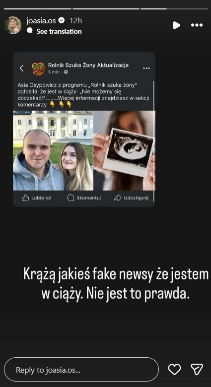 Joanna Osypowicz z programu „Rolnik szuka żony” zamieściła na jednej z internetowych relacji screen przedstawiający post opublikowany w sieci. Wynika z niego, że Asia i Kamil mają spodziewać się dziecka. Do wpisu szybko odniosła się sama zainteresowana. Uczestniczka show stanowczo zaprzeczyła, pisząc: