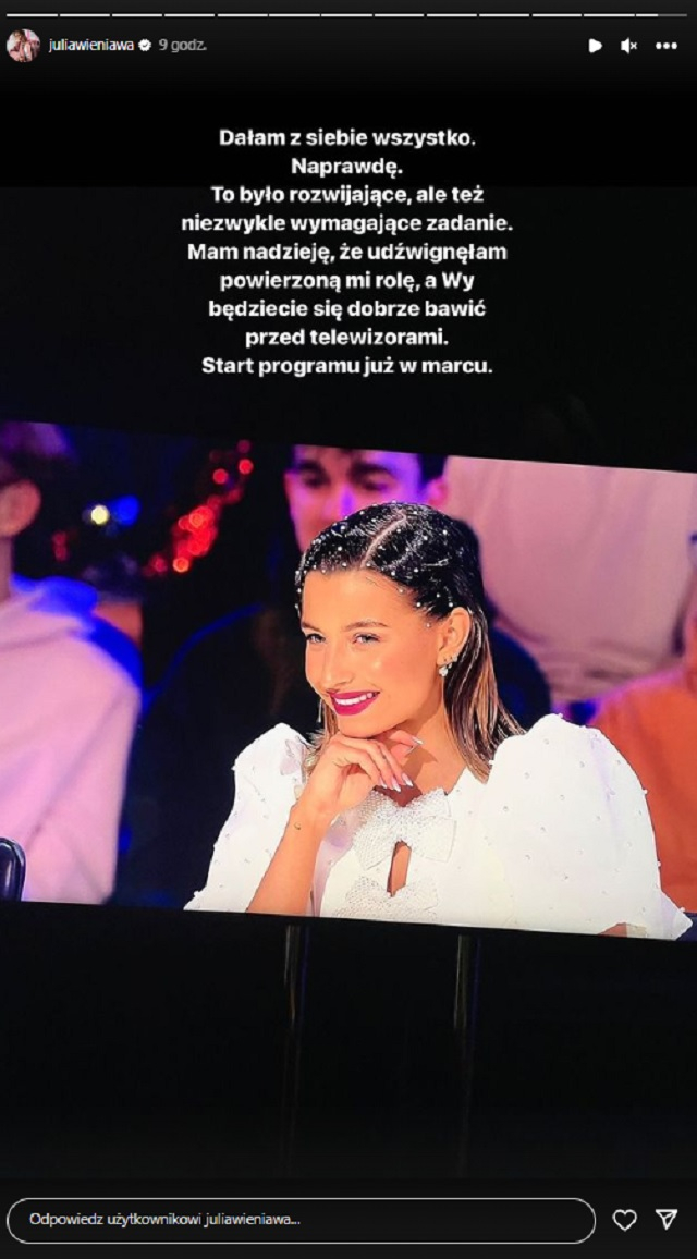 Julia Wieniawa zamieściła w sieci krótki komentarz dotyczący jej przygody z telewizyjnym formatem, która wciąż trwa: