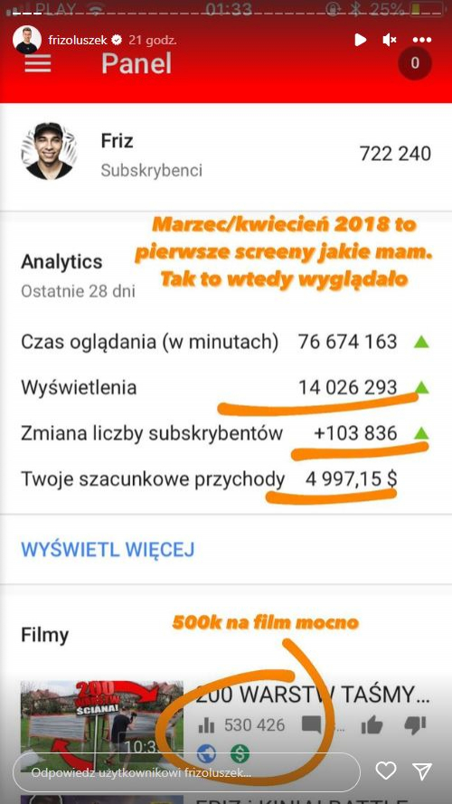 We wtorek Wiśniewski podzielił się na Instagramie zrzutami ekranu sprzed kilku lat. Możemy na nich zobaczyć, jak na początku kariery wyglądały jego zarobki z twórczości na YouTube. Pięć lat temu w tym samym okresie Friz miał już 722 tys. widzów w serwisie wideo. Jego filmy generowały wówczas miesięczne przychody w wysokości 5 tys. dolarów – na dziś to około 21 tys. zł. Kilka tygodni później było to już ponad 10 tys. dolarów, a więc około 42 tys. zł.
