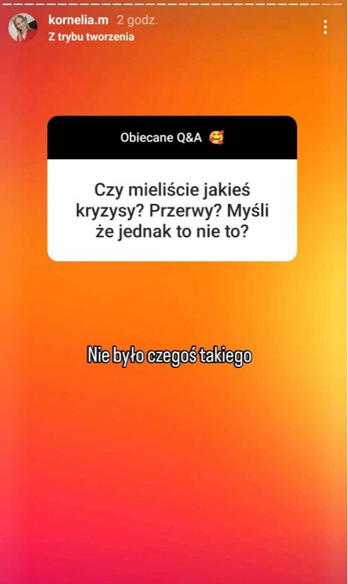Ostatnio Kornelia zorganizowała na swoim Instagramowym profilu zabawę w pytania i odpowiedzi. Jedna z internautek była ciekawa, czy w małżeństwie jej i Marka były już jakieś kryzysy, przerwy lub myśli, że może to nie to.