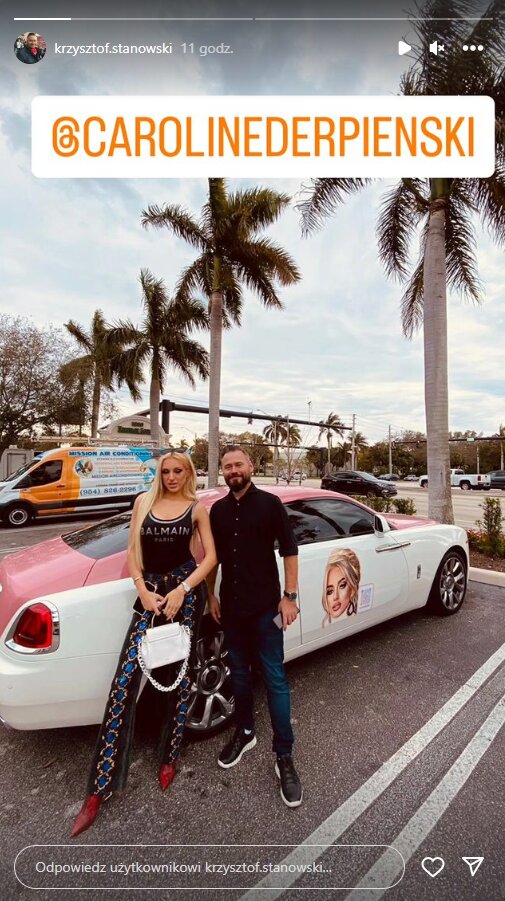 Jak obiecał, tak uczynił. Na instagramowej relacji Krzysztofa Stanowskiego pojawiły się zdjęcia z Miami, na których pozuje w towarzystwie Caroline Derpienski. Na razie wiemy, że „Dollarsowa Królowa” pokazała dziennikarzowi swoje ukochane auto, które zostało specjalnie dla niej spersonalizowane – ma wiele różowych elementów, a na drzwiach znajduje się wielka podobizna kobiety.