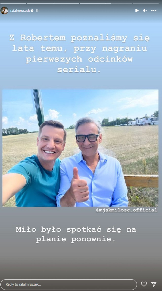 Z Robertem poznaliśmy się lata temu, przy nagraniu pierwszych odcinków serialu. Miło było spotkać się na planie ponownie – wyznał Rafał Mroczek, oznaczając oficjalny profil „M jak miłość”.