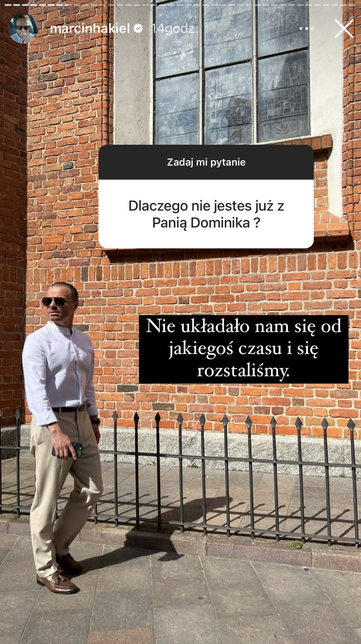 Wiele wskazywało na to, że miłość znów zagościła w sercu Marcina. Niestety, niedawno stało się coś, co zaniepokoiło jego obserwatorów. 40-latek przestał bowiem publikować nowe zdjęcia z dziewczyną. Jak się teraz okazuje, ich związek się zakończył. Kilka dni temu Dominika wyznała, że choć nie ma już kontaktu z Hakielem, to wciąż utrzymuje ciepłe relacje z jego byłą żoną, Katarzyną Cichopek.