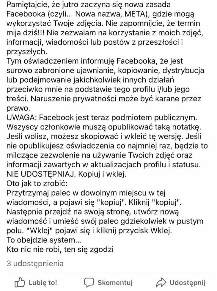 Radzimy wam nie udostępniać takiego oświadczenia, ponieważ absolutnie nic ono nie wnosi i nie ma żadnej mocy prawnej. Groźby o rzekomym przejęciu danych przez Facebooka w przypadku nieopublikowania takiej treści, są zwyczajnym kłamstwem i grą na emocjach.