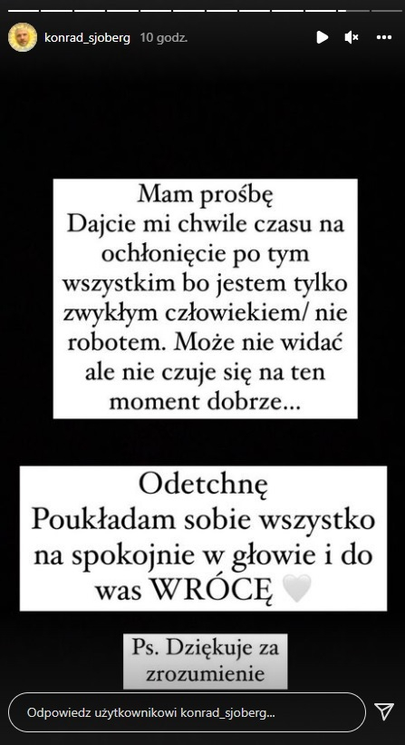 Mam prośbę. Dajcie mi chwilę czasu na ochłonięcie po tym wszystkim, bo jestem tylko zwykłym człowiekiem/nie robotem. Może nie widać, ale nie czuję się na ten moment dobrze… Odetchnę, poukładam sobie wszystko na spokojnie w głowie i do was WRÓCĘ. Ps. Dziękuję za zrozumienie.