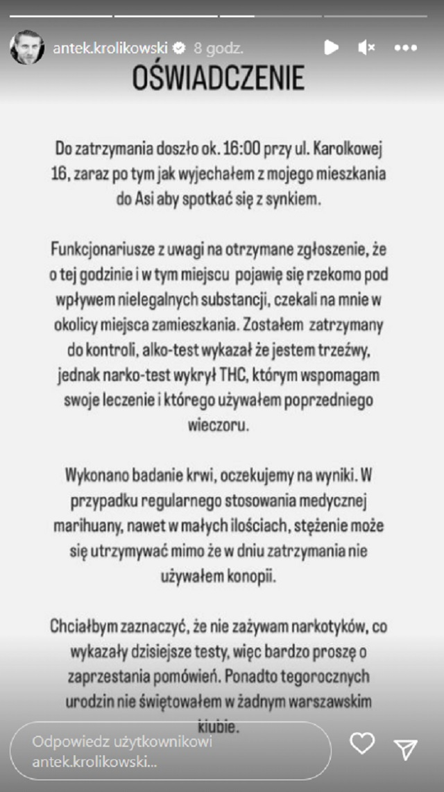 Do zatrzymania doszło około 16 przy ul. Karolkowej 16, zaraz po tym, jak wyjechałem z mojego mieszkania do Asi, aby spotkać się z synkiem. Funkcjonariusze z uwagi na otrzymane zgłoszenie, że o tej godzinie i w tym miejscu pojawię się rzekomo pod wpływem nielegalnych substancji, czekali na mnie w okolicy miejsca zamieszkania. Zostałem zatrzymany do kontroli, alko-test wykazał, że jestem trzeźwy, jednak narko-test wykrył THC, którym wspomagam swoje leczenie i którego używałem poprzedniego wieczoru. Wykonano badanie krwi, oczekujemy na wyniki. W przypadku regularnego stosowania medycznej marihuany, nawet w małych ilościach, stężenie może się utrzymywać mimo że w dniu zatrzymania nie używałem konopii. Chciałbym zaznaczyć, że nie zażywam narkotyków, co wykazały dzisiejsze testy, więc bardzo proszę o zaprzestanie pomówień. Ponadto tegorocznych urodzin nie świętowałem w żadnym warszawskim klubie.