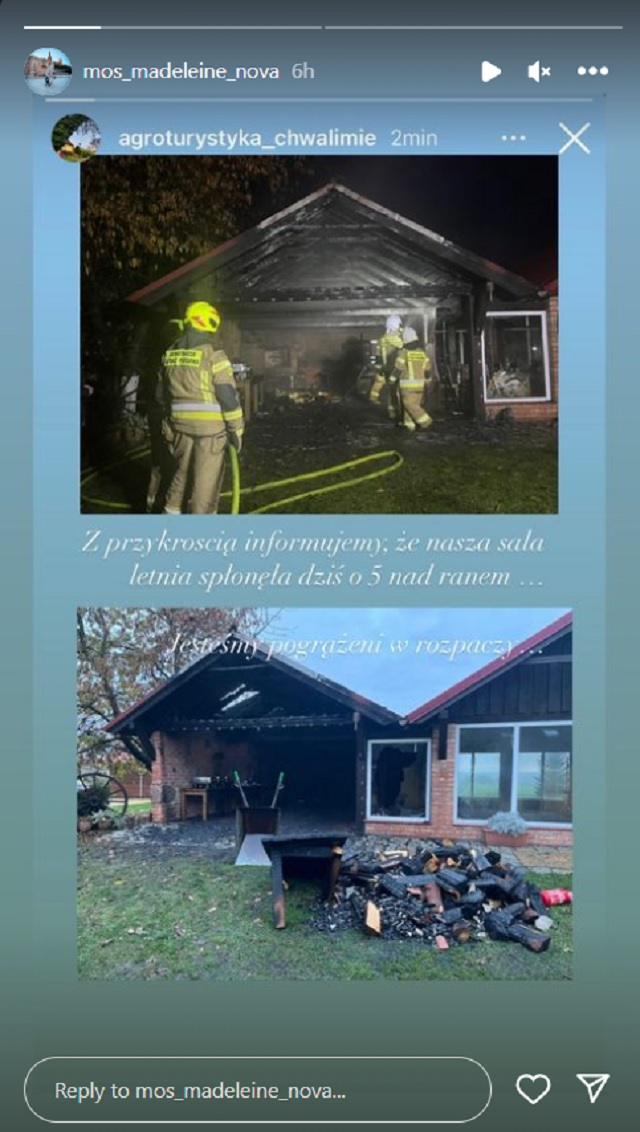 (…) W zaledwie kilka minut zostaliśmy pozbawieni głównego dochodu (…). Wiata, a inaczej sala letnia, w której odbywała się impreza, stanęła w płomieniach mimo stałej kontroli komina. Zawiodła wyobraźnia ludzi trzecich, którzy wynajęli obiekt. Konstrukcja sali grozi zawaleniu, żadne z okien nie wytrzymało tak wysokiej temperatury, podłoga także nie przetrwała. Okna spadały z dachu. Widok był przerażający. Łzy same płynęły po policzkach… - pisała.