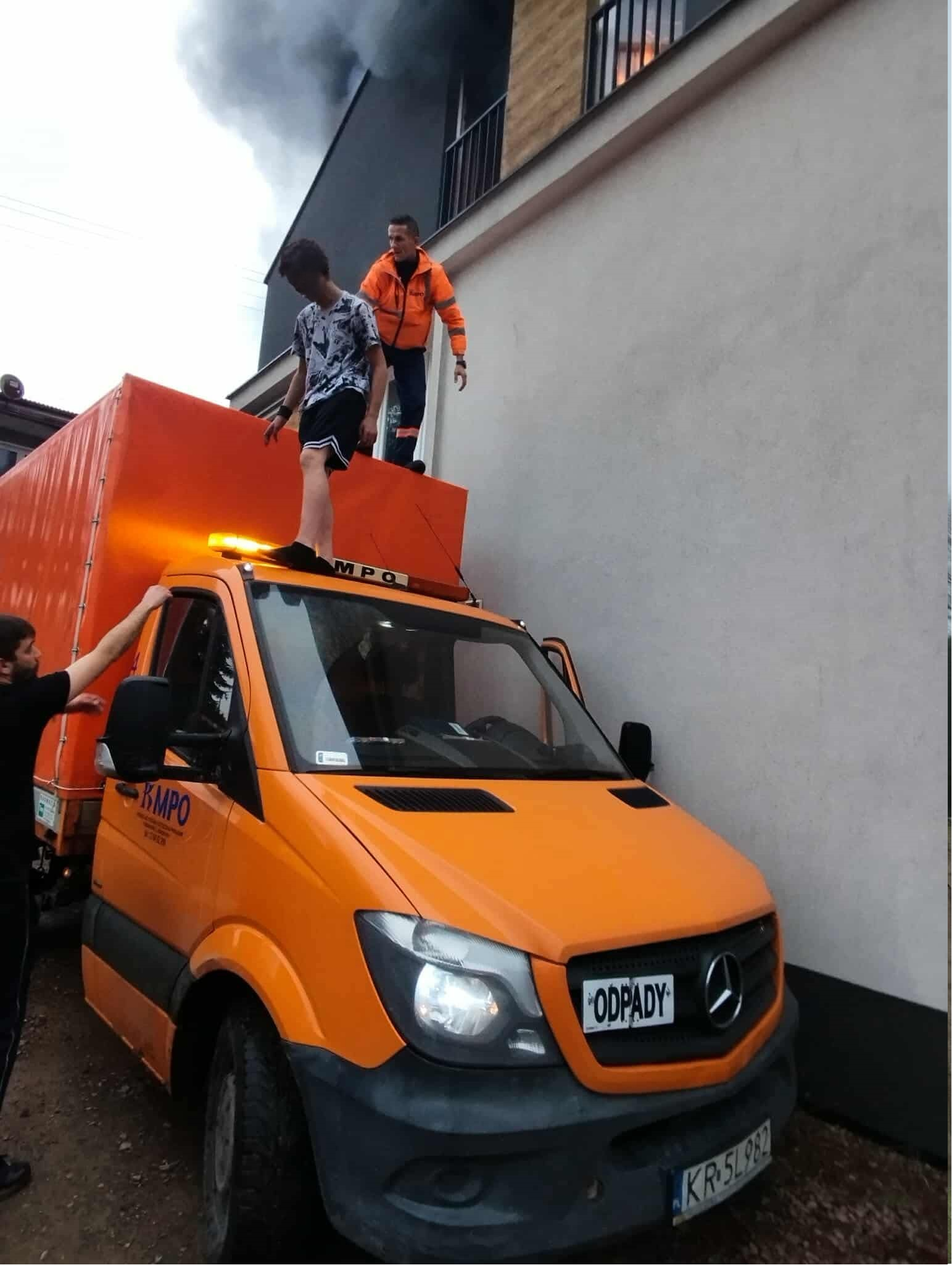"To był taki instynkt od razu, żeby zareagować jako pracownik miejski. Zobaczyłem płomień, zobaczyłem w powietrzu dziecko, że trzyma się rękami parapetu i ludzi, którzy chcieli, aby dziecko skoczyło na rozłożoną kurtkę" – relacjonuje Łukasz Jastrzębski pracownik MPO. Ludzie chcieli, żeby chłopak skoczył z 6 metrów na ziemię no ale, że my firmie mamy Sprintery z dużą paką, więc od razu wpadło mi do głowy, że to się może przydać. Pomyślałem, że jak podjadę i wyjdę na pakę, to ściągnę to dziecko.