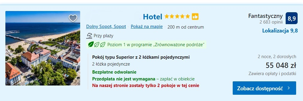 Wynajmując znajdujący się w sercu Sopotu hotel, który jest jednym z wielu obiektów w sieci należącej do amerykańskiej spółki, trzeba nastawić się na ogromny wydatek. By spędzić dwie noce (21.08-23.08) w dwuosobowym pokoju typu superior, trzeba zapłacić nieco ponad 55 tysięcy złotych. Sypialnia określona jako „superior” to pomieszczenie o nieco wyższym standardzie, ale nie tak luksusowe, jak wnętrze uznane przez właścicieli jako pokój „deluxe”. W sierpniu, zwłaszcza w dniach, kiedy do miasta zjeżdżają tłumy gwiazd na letni festiwal, obłożenie w tym hotelu jest naprawdę duże. Szukając pokoju w popularnych serwisach do rezerwowania miejsc hotelowych, trudno znaleźć dostępny nocleg. Wynajęcie pokoju o takim samym standardzie w tym samym obiekcie we wrześniu jest zdecydowanie tańsze. Na przykład pobyt od 4 do 6 września kosztuje 1470 złotych.
