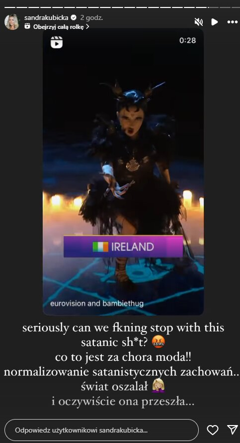 Swoje zdanie na temat Eurowizji wyraziła również Sandra Kubicka. Modelka napisała kilka zdań na temat występu Bambie Thug na Instagramie. Nie kryła, że jest rozczarowana tym, iż Irlandia awansowała do sobotniego finału. Użuła do tego dość mocnych słów.