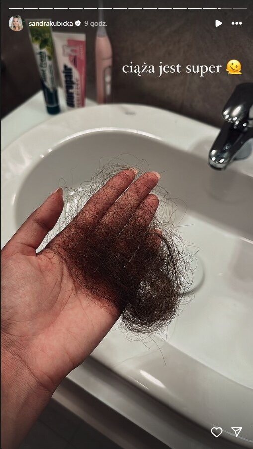 Choć kobieta już jakiś czas temu podjęła walkę z wypadaniem włosów, które pojawiło się w ciąży, problem nadal nie zniknął. Na Instagramie pokazała ostatnio, ile ciemnych pasm wyczesała podczas standardowej pielęgnacji. Włosy, które straciła, zajęły niemal całą dłoń!