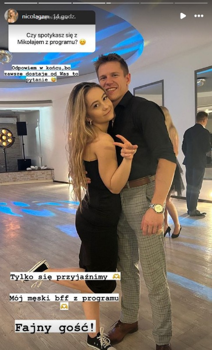 Nicola niedawno zorganizowała sesję Q&A na swoim profilu na Instagramie, gdzie odpowiedziała na różne pytania. Odniosła się w nich między innymi do spekulacji dotyczących jej rzekomego związku z Mikołajem, kandydatem Anny Derbiszewskiej. 22-latka opublikowała zdjęcie, na którym tańczy ze wspomnianym uczestnikiem i odpowiedziała, czy się z nim spotyka:
