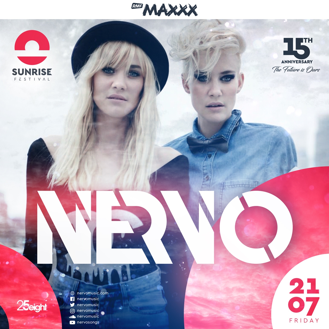 Nervo to DJ-ski duet nieziemsko utalentowanych bliźniaczek pochodzących z dalekiej Australii. Światową sławę przyniosły im utwory napisane i wyprodukowane dla gwiazd z popowego topu – Kylie Minoque, The Pussycat Dolls czy Miley Cyrus, a ukoronowaniem ich kariery było zdobycie nagrody Grammy za napisany dla Davida Guetty i Kelly Rowland hit „When Love Takes Over” i wypuszczenie wielkich przebojów wraz z Afrojackiem i Dimitri Vegas & Like Mike „The Way We See The World“ oraz R3habem i Ummetem Ozcanem „ Revolution”. Sensacją okazał się również ich debiutancki album „Collataral“ na którym znalazł się hit „Hold On“, przez dwa tygodnie numer jeden listy „Dance Club Songs“ amerykańskiego Billboardu. Dziewczyny doskonale radzą sobie nie tylko w studio, ale także grając na żywo przed klubową i festiwalową publicznością, o czym z pewnością mogli przekonać się wszyscy uczestnicy Sunrise Festival. Duet Nervo będzie można ponownie zobaczyć i posłuchać w akcji w piątek 21 lipca na scenie na parkingu.
