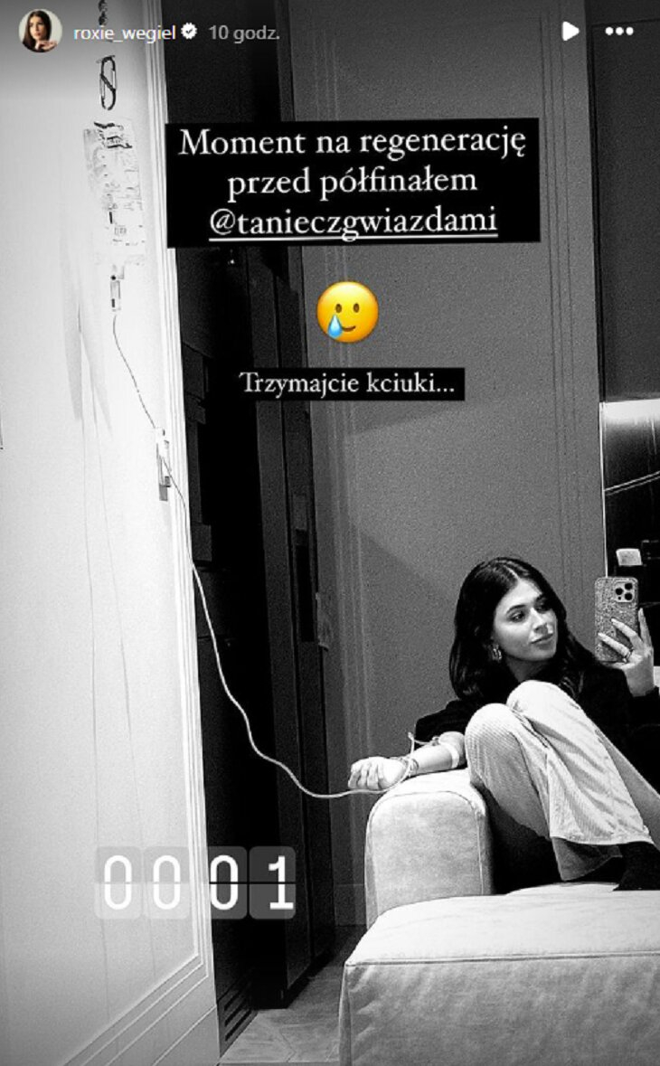 Roksana Węgiel przygotowuje się do półfinału "Tańca z gwiazdami". Fani artystki mogli się nieco zaniepokoić po tym, jak 24 kwietnia tuż po północy zamieściła na Insta Story czarno-białą fotografię. Wokalistka siedzi na kanapie i jest podpięta do kroplówki. Kadr podpisała takim komentarzem: