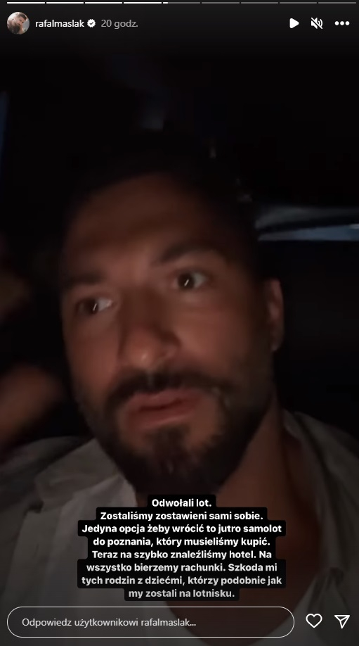 Do ceny nowych biletów, skrupulatnie dodał konieczność wykupienia dodatkowej doby na parkingu, gdzie zaparkował samochód. Rafał Maślak wyliczył także, że musiał wykupić kolejny nocleg w hotelu, by nie spać na lotnisku. Ostatecznie okazało się, że model i jego małżonka niepotrzebnie kupowali bilety na własną rękę. Przewoźnik ogłosił, że podstawi zastępczy samolot. Były mister może jednak spać spokojnie, bo, jak sam relacjonował, prawdopodobnie linie lotnicze zwrócą mu wydane pieniądze.