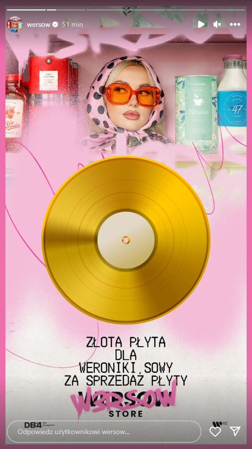 Wrzuciłam ten banner informujący, że płyta „WERSOW STORE” jest złota. Właśnie dostałam informację i potwierdziłam to oficjalnie z moim menagementem, więc bardzo, bardzo, bardzo się cieszę, że mogę Wam to przekazać. Za mną stoi złota płyta za piosenkę „Ten jeden moment”, który teraz jest już platyną. Złota też jest piosenka „O północy”, wiec to jest niesamowite, że ja Wam mówię o tym, że to się dzieje i te moje działania muzyczne przekształciły się dla mnie w coś bardzo dużego. […] Dziękuję Wam ogromnie za wsparcie.