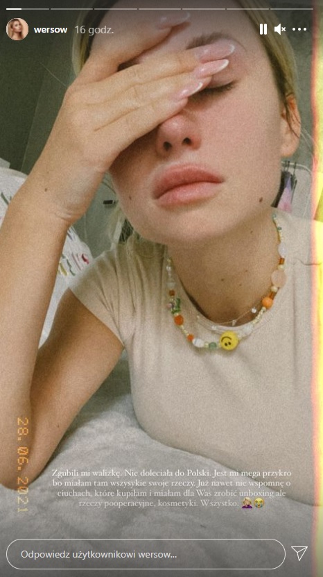 Zgubili mi walizkę. Nie doleciała do Polski. Jest mi mega przykro bo miałam tam wszystkie swoje rzeczy. Już nawet nie wspomnę o ciuchach, które kupiłam i miałam dla Was zrobić unboxing ale rzeczy pooperacyjne, kosmetyki. Wszystko. – napisała influencerka na Instagramie.