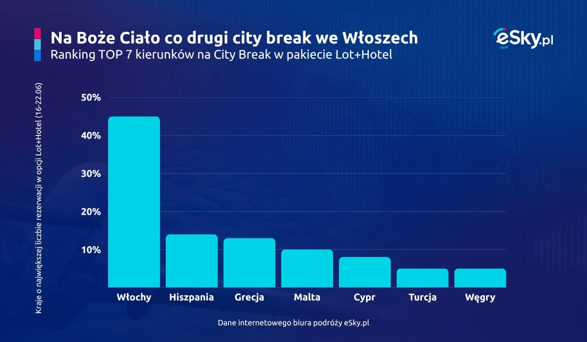 Z najnowszego rankingu eSky.pl wynika, że aż 45 proc. wszystkich rezerwacji city breaków na długi weekend Bożego Ciała dotyczy Włoch. Polacy najchętniej wybierają Rzym, Mediolan, Wenecję, ale także nadmorskie Rimini czy malownicze okolice jeziora Garda. „Włochy to bezapelacyjny lider wśród city breaków na długi weekend związany z Bożym Ciałem” – podkreślają eksperci eSky.pl. Najtańsze pakiety Lot+Hotel można znaleźć już od 730 zł za osobę.
