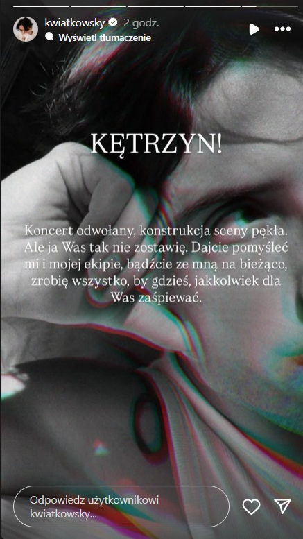Na instagramowym profilu Dawida Kwiatkowskiego pojawiło się ogłoszenie, w którym artysta zwrócił się bezpośrednio do fanów wybierających się na piątkowy, wieczorny koncert do Kętrzyna: