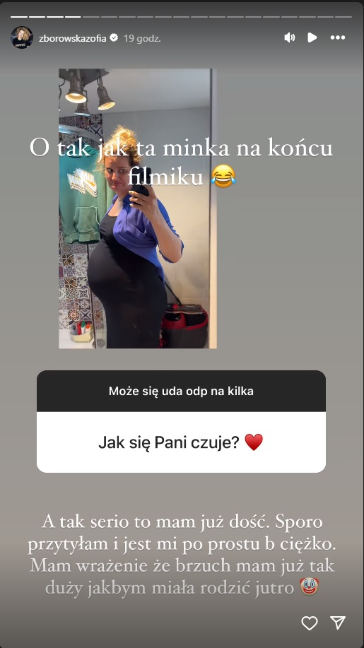 Żona Andrzeja Wrony po raz kolejny zorganizowała serię Q&A, a internauci skorzystali z okazji i zapytali o kilka kwestii związanych z ciążą. Jedna z osób chciała wiedzieć, jak czuje się Zofia Zborowska. W odpowiedzi aktorka nagrała filmik, na którym zrobiła zabawną minę, a następnie na poważnie przyznała, że jest już wyczerpana.