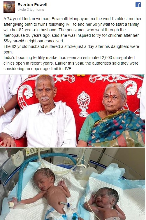 Po 50 latach starań o dziecko, które nie przynosiły skutku, indyjskie małżeństwo decyduje się na metodę in-vitro, która wreszcie kończy się powodzeniem. Po 9 miesiącach, dzięki cesarskiemu cięciu na świat szczęśliwie przychodzą dwie dziewczynki, a Erramatii staje się najstarszą mamą świata. Kobieta ze względu na swój wiek nie jest w stanie karmić dzieci, dlatego pokarm w pierwszych miesiącach ich życia zostanie im zapewniony przez specjalne banki mleka.