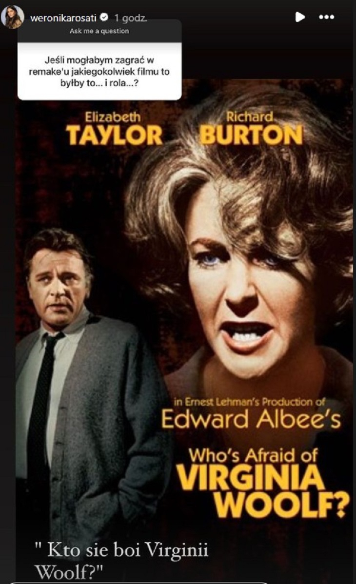 Weronika Rosati nie ograniczyła się jednak tylko do wyjawienia alternatywnej ścieżki kariery. Gwiazda podzieliła się również swoim aktorskim marzeniem. Okazuje się, że 40-latka, gdyby miała taką okazję, chętnie zagrałaby w remake’u kultowego filmu "Kto się boi Virginii Woolf?". W 1966 roku adaptację filmową tego słynnego dramatu nakręcił Mike Nichols z Richardem Burtonem, Elizabeth Taylor, George'em Segalem i Sandy Dennis w rolach głównych. Nic dziwnego, że aktorka to właśnie tę produkcję wskazała jako swojego faworyta. Rosati nierzadko mówi o tym, że jest fanką Elizabeth Taylor, a jej córka otrzymała imię właśnie na cześć amerykańskiej gwiazdy kina.