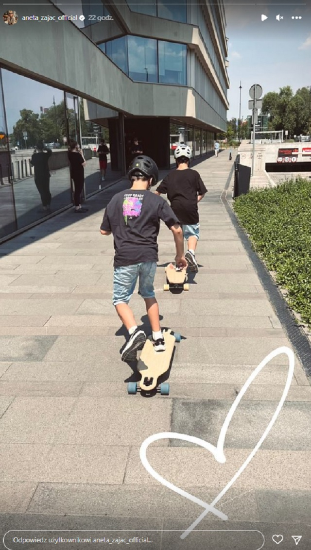 Gwiazda serialu „Pierwsza miłość” dba o prywatność swoich pociech. Stąd też nie zamieszcza w mediach społecznościowych fotografii czy nagrań, na których twarze jej synów są w pełni widoczne. Nie oznacza to jednak, że Aneta Zając całkowicie zrezygnowała z publikowania uroczych rodzinnych kadrów! Odtwórczyni roli Marii Domańskiej (z domu Radosz) w „Pierwszej miłości” znalazła sposób na to, by dzielić się z innymi swoją radością płynącą z macierzyństwa. Od czasu do czasu gwiazda „przemyca” migawki przedstawiające Roberta i Michała podczas wykonywania różnych rzeczy. Chłopcy zazwyczaj są ustawieni tyłem lub bokiem do obiektywu i nie inaczej było w tym przypadku. Na jednej z instagramowych relacji Zając zamieściła zatrzymany w kadrze moment relaksu jej pociech. Bliźniacy wybrali się na przejażdżkę, a ich środkami transportu po mieście zostały deskorolki!