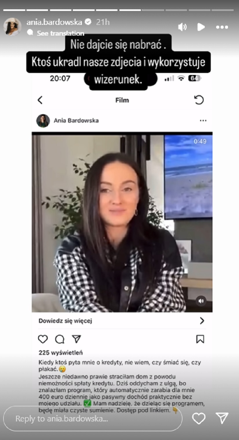 Anna Bardowska postanowiła ostrzec obserwatorów jej konta na Instagramie przed nieprawdziwym kontem.