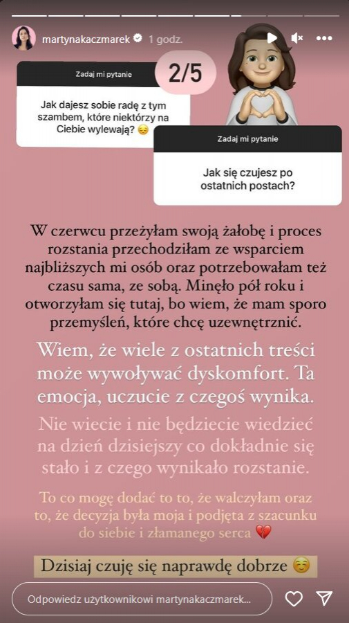 Na InstaStory Kaczmarek odpowiedziała na pytanie zadane przez użytkownika, dotyczyło ono samopoczucia influencerki po ostatniej serii postów.