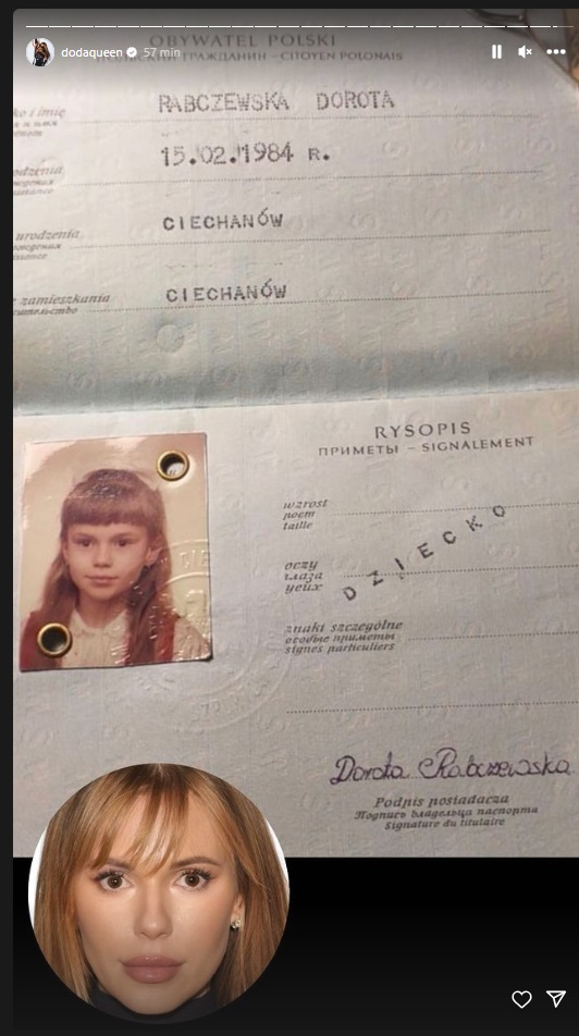 Na uwagę zasługuje autograf przyszłej gwiazdy. Dorota Rabczewska jak na początkującą uczennicę miała całkiem wyrobiony charakter pisma. W miejscu przeznaczonym na podpis posiadacza paszportu wykaligrafowała duże, okrągłe litery. Duże odręczne litery charakteryzują ludzi otwartych, serdecznych i pewnych siebie. Często wskazuje na wysoką samoocenę. Z kolei okrągłe – osoby wesołe.