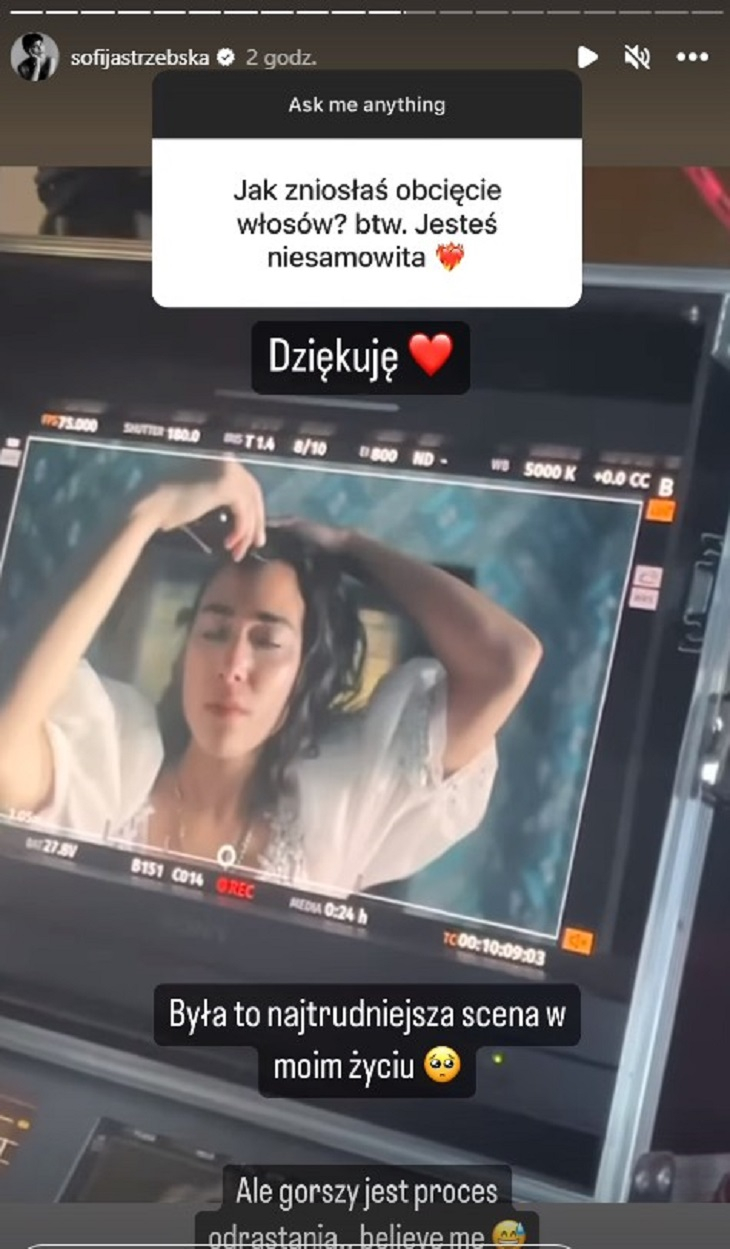 Nie tak dawno aktorka zorganizowała na swoim Instagramie sekcję Q&A, w której odpowiedziała między innymi na pytania związane z powstawaniem serialu. Największe zainteresowanie wśród fanów wzbudziło poświęcenie 25-latki, która specjalnie na potrzeby serialu zgoliła włosy. Scena ta została nawet uwieczniona w "Infamii". Obserwatorka zapytała Jastrzębską, jak zniosła obcięcie włosów. Aktorka odpowiedziała: