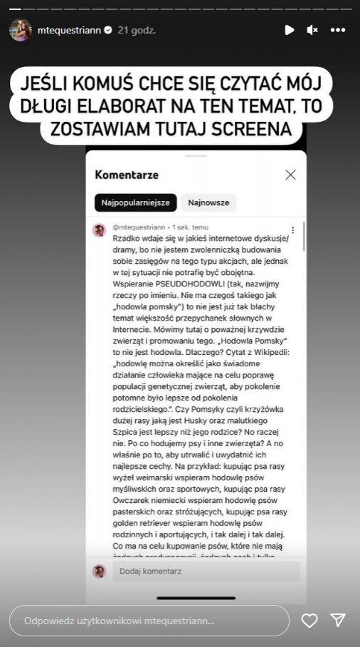 O sprawie wypowiedziały się również influencerki ze środowiska jeździeckiego. Jedna z nich napisała obszerny komentarz z wyjaśnieniem, że hybryda, jaką jest pomsky, nie powinna w ogóle występować.