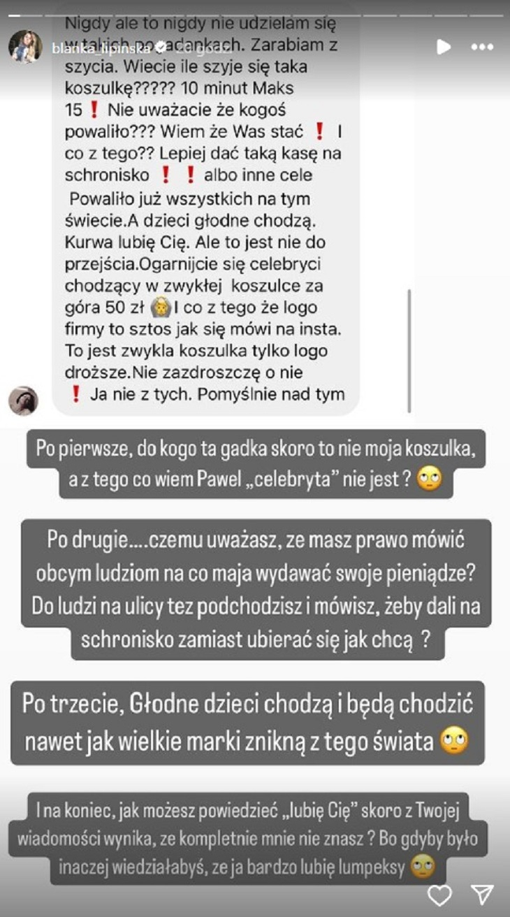 Lipińska ostatnio zdecydowała się wspierać swojego partnera, Pawła, w sprzedaży ekskluzywnej koszulki marki Balmain. Na swoim profilu na Instagramie zamieściła informację o poszukiwaniu nabywcy na wspomniany element garderoby. Sprawa ta nie obeszła się bez pewnych trudności, ponieważ luksusowy przedmiot stał się przyczyną nowego skandalu. Jedna z internautek wytknęła celebrytce, że ta kupuje rzeczy niewarte swojej ceny i zasugerowała jej przeznaczanie pieniędzy na akcje charytatywne zamiast na ubrania. Celebrytka w odpowiedzi na wiadomość od followerki nagrała Stories, w którym powiedziała: