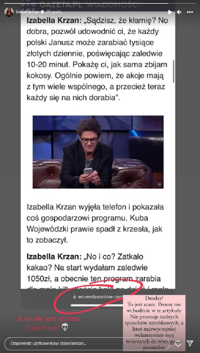 Drodzy! To jest scam (oszustwo – przyp. red). Proszę, nie wchodźcie w te artykuły. Nie promuję żadnych sposobów zarobkowych, a ktoś najzwyczajniej wykorzystuje mój wizerunek do wyciągania pieniędzy - apelowała w komentarzu.