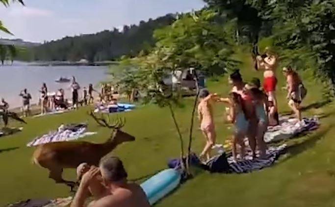 Wypoczywający nad jeziorem Solińskim plażowicze przeżyli chwilę grozy! Nagle z wody zaczął wyłaniać się jeleń, który następnie wbiegł na plażę pełną ludzi! W pewnym momencie przeskoczył obok siedzącej na kocu rodziny i szybko pobiegł na drogę. Słuchacz RMF FM Dariusz uchwycił ten moment - zobaczcie film!