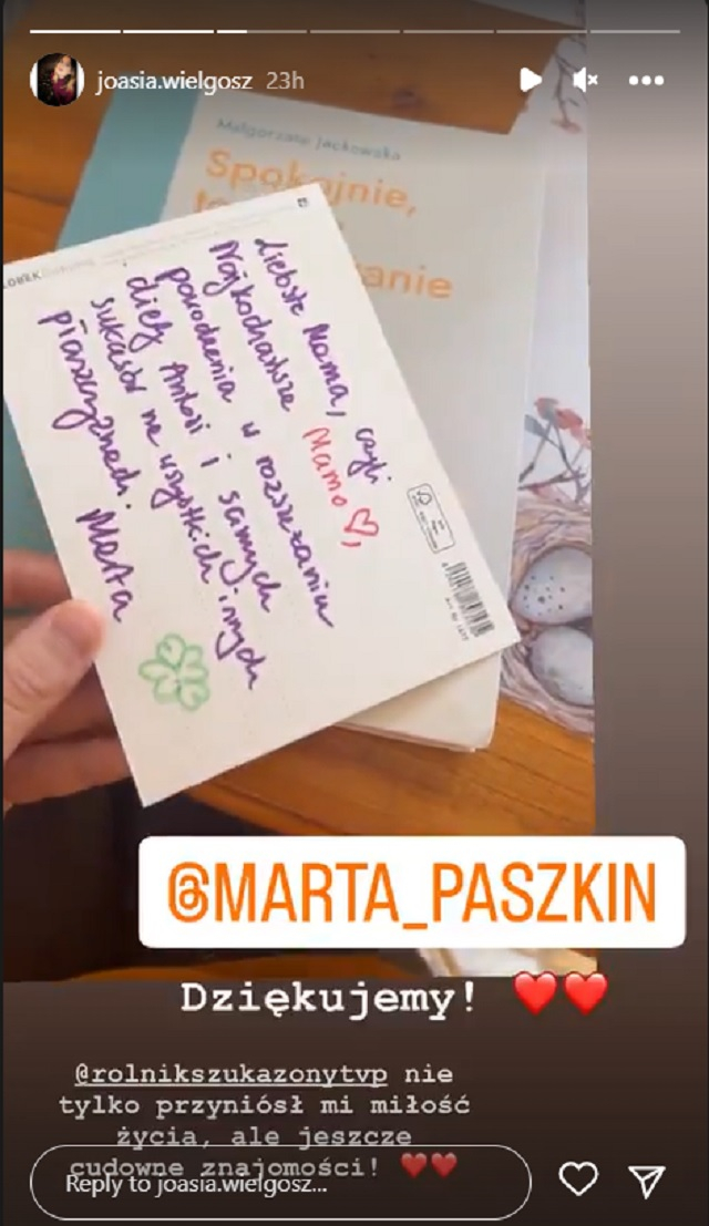 Joanna z „Rolnik szuka żony 8” opublikowała na instagramowej relacji krótkie nagranie ukazujące odręcznie napisany liścik dołączony do prezentu – książki o rozszerzaniu diety u dzieci.