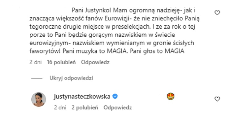 fot. Komentarz pod postem Justyny Steczkowskiej na Instagramie