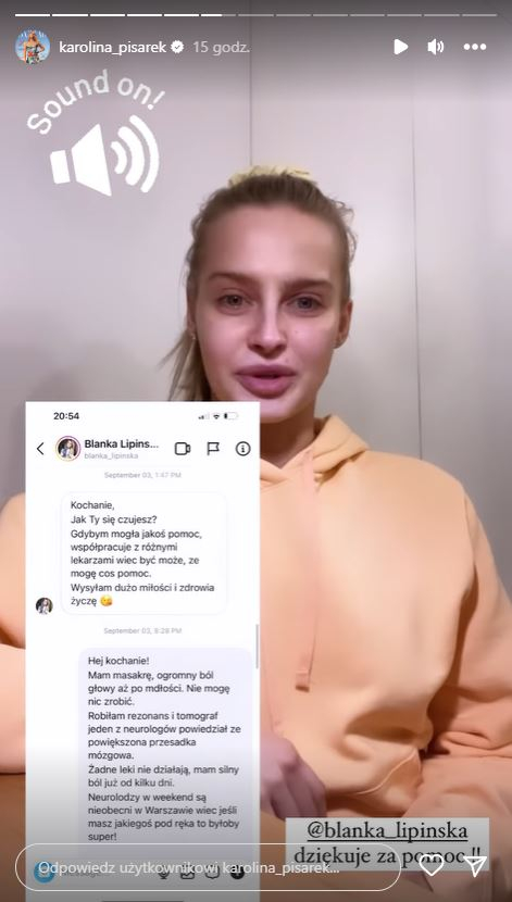 Na początku września do mediów trafiły niepokojące informacje o stanie zdrowia Karoliny Pisarek-Salli. Modelka, która wówczas występowała w "Tańcu z Gwiazdami", trafiła do szpitala z powodu silnego bólu głowy. 25-latka wyznała w środę na Instagramie, że przez kilka dni nie była w stanie poradzić sobie z dolegliwościami. Z pomocą przyszła jej dopiero Blanka Lipińska, która poleciła odpowiednich lekarzy.