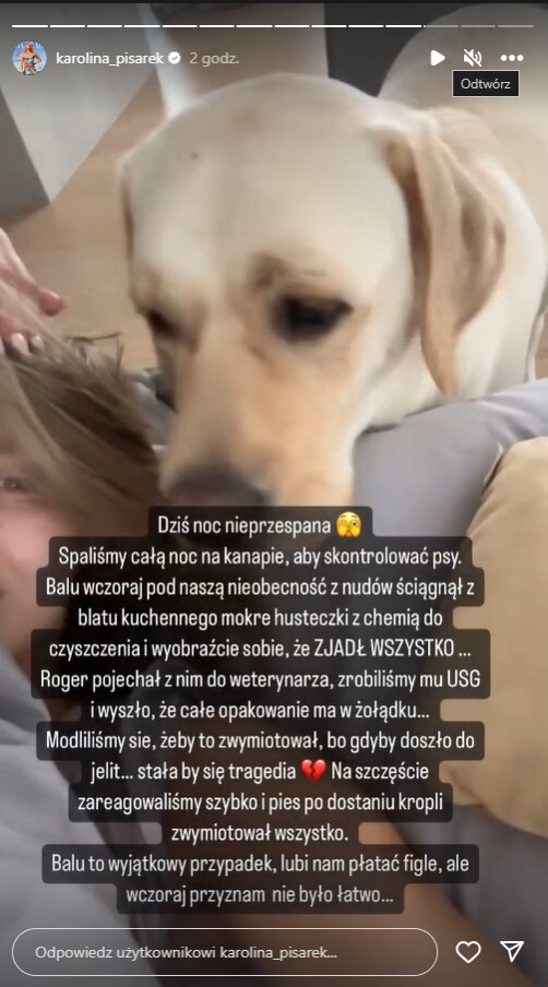 Roger pojechał z nim do weterynarza, zrobiliśmy mu USG i wyszło, że całe opakowanie ma w żołądku… Modliliśmy się, żeby to zwymiotował, bo gdyby doszło do jelit… stałaby się tragedia. Na szczęście zareagowaliśmy szybko.
