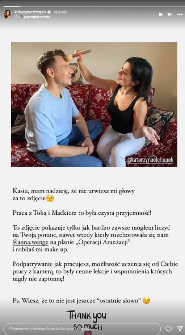 Tuż po ogłoszeniu zaskakującej nowiny w mediach zaczęły pojawiać się liczne komentarze. Głos ponownie zabrała też sama Kasia Cichopek: opublikowała bowiem na instagramowych relacjach wpisy jej koleżanek i kolegów z pracy, którzy wspominali wspólnie spędzone chwile.